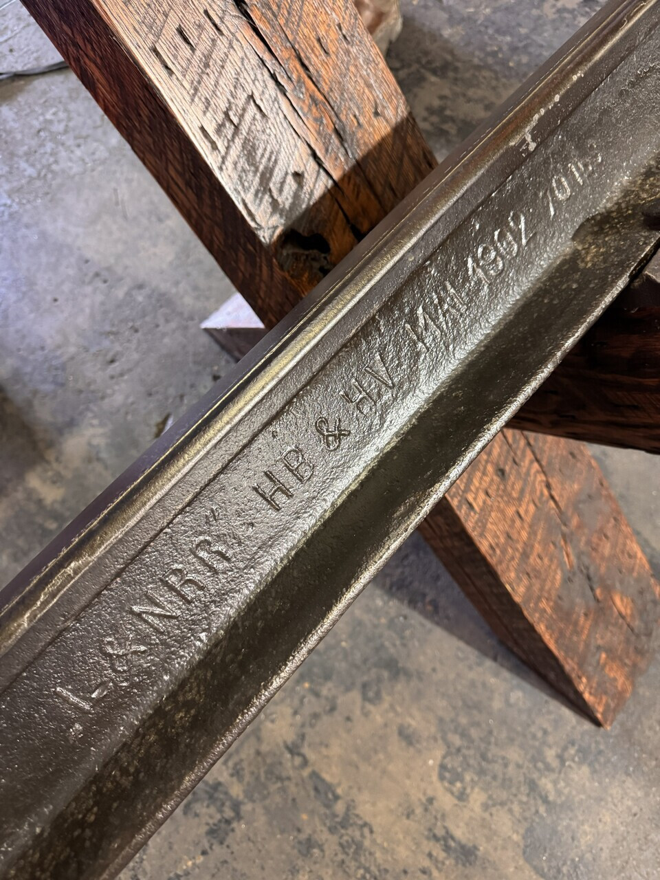 While we build our furniture in America, we honor the global history of the railroads themselves. This rail, forged in Germany and laid for the L&N more than a century ago, represents the reach and strength of that era.